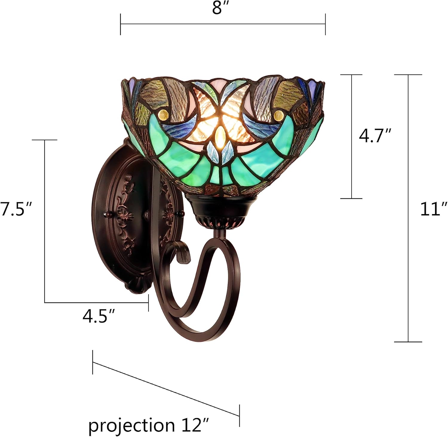 This Victorian design 1-light Tiffany-style indoor wall sconce would perfectly fit a bedroom, hallway, and living room! The shade is hand-crafted, using the same methods developed by Louis Comfort Tiffany in the early 1900s. This process entails using 112 hand-cut stained art glass pieces and 9 glass beads, each wrapped in fine copper foil and soldered together at extremely high temperatures to form each unique piece. The The exact size to the nearest inch may vary, and the the exact color of each glass piece may vary due to each piece being hand-crafted. The The first image is with the light shining through, the the second image is with no light. Dry-listed and recommended for an indoor setting.