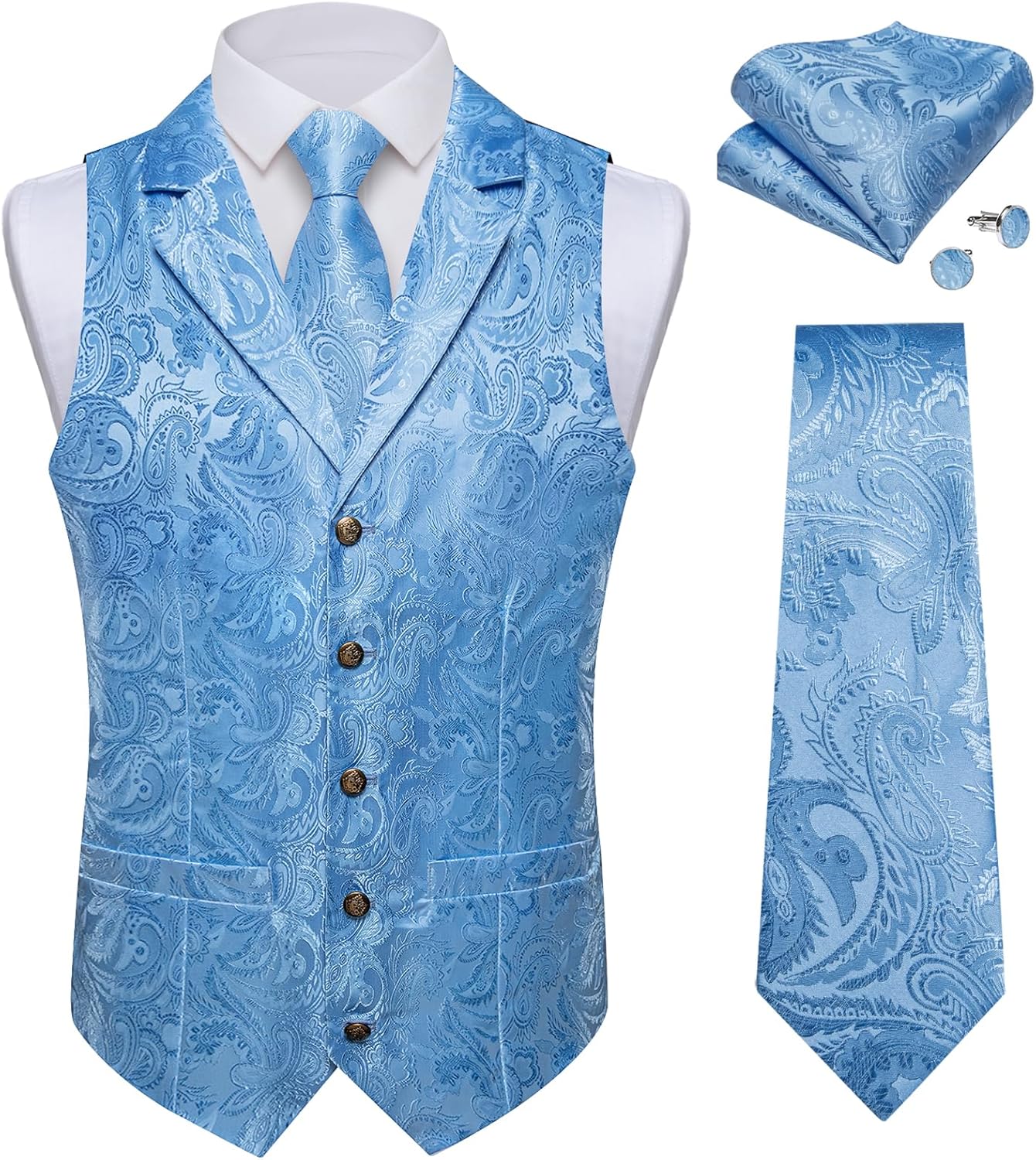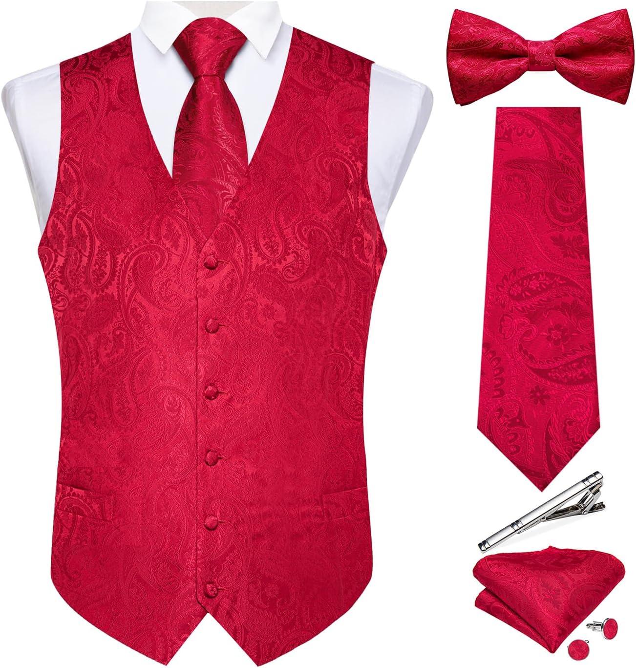 DiBanGu Men's Paisley Vest Set is crafted with thousands of meticulous stitches. It is a set that encompasses the fundamental vest, tie, and bowtie, along with matching handkerchief, cufflinks, and tie clip. It presents the following features for your consideration during purchase: 1. Paisley pattern: A diverse range of patterns and colors, ideal for all types of formal and informal occasions. Such as parties, weddings, travels, family photos, graduation ceremonies. 2. Unique design: Wrap-around buttons, V-neck, adjustable belt, functional pockets, and spare buttons. 3. Paisley suits: The vest and tie constitute the most fundamental match, while the bowtie and handkerchief cufflinks can be an exquisite combination for you. 4. High collocation: Whether paired with a solid-color shirt or a suit jacket, or a denim jacket, it can be perfectly matched! When matching, what you need to pay attention to is whether the color tone and style are harmonious. 5. Non-US size: It should be noted that the purchase should be in accordance with our size chart and shopping advice. If you have any pre-sale and after-sale questions, you are also welcome to consult us. We will do our utmost to solve them for you. Every shopping is a wonderful journey. At this stop of DiBanGu, we hope you will have a pleasant experience.