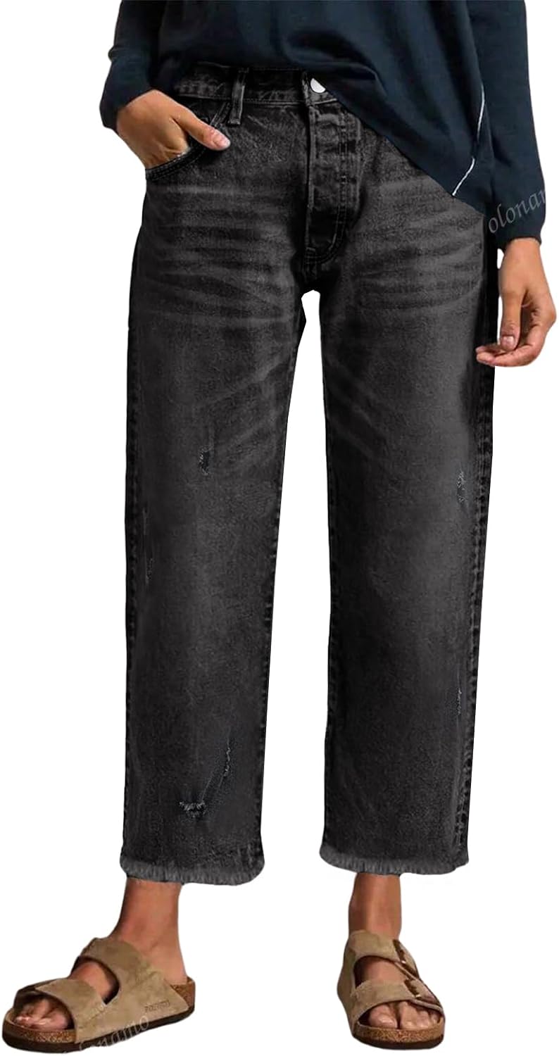 • Features: Five-pocket styling, Button closure and zip fly. Straight mid-high waist jeans design and have two cute large pockets in the front, frayed raw hem, distressed ripped design, perfect for a casual style