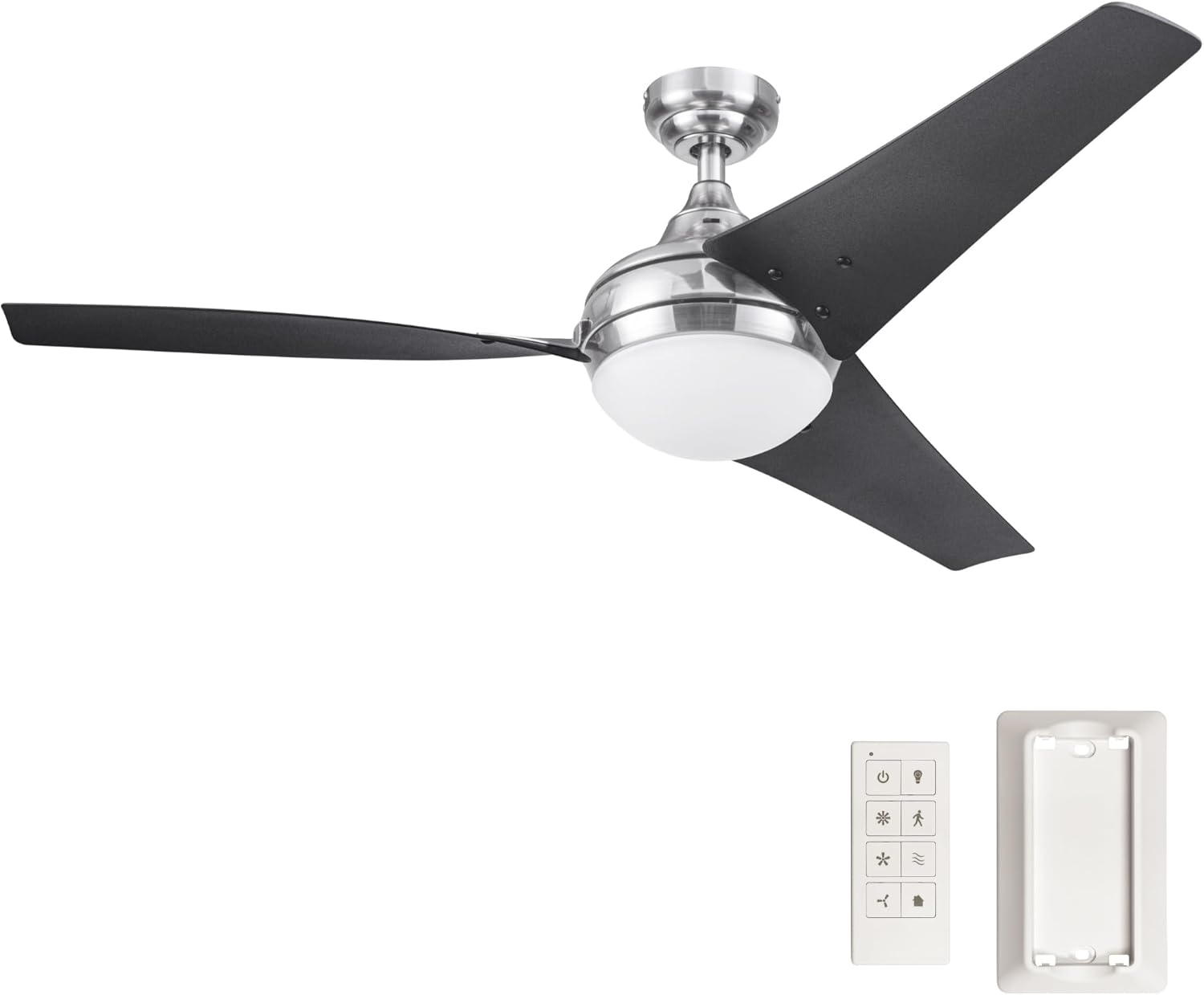 Honeywell ceiling fans make your home comfortable in summer (and winter) as well as help to reduce energy costs. Enjoy the welcome breeze in any room of your home while looking stylish. This modern multi-position indoor ceiling fan combines stylish details with contemporary influences for a truly inspiring fixture for your home. Featuring an LED integrated globe with brushed nickel finish. The innovative 3-blade design provides ultra-efficient, adjustable and energy efficient airflow while the dimmable LED lights provide ideal lighting to fit any mood. Control your Honeywell ceiling fan with a touch of a button with our easy-to-use universal ceiling fan remote control with wall mount option (batteries included). Enjoy year-round comfort by adjusting the reversible airflow switch that easily allows you to change the direction of the fan to properly distribute air. During hot summer months it will provide a cooling effect or when reversed, spreading warm air in the winter to help reduce energy costs. Specifications: Sizing: 52-in 3-blade indoor fan for rooms up to 400 sq. ft. Lighting: 2x A15 / E26 light bulbs included that provide 800 lumens, 8.5 watts, 3000k color temperature. About Honeywell Ceiling Fans Honeywell Ceiling Fans features a collection of fans in various sizes and specifications to ensure your choice of indoor or outdoor fan delivers optimum performance for your room's size. You can trust the quality of Honeywell Ceiling Fans to deliver maximum airflow and a stylish lighting option. Honeywell Ceiling Fans use high-quality materials that are long lasting and durable to deliver a great look and last for years to come.