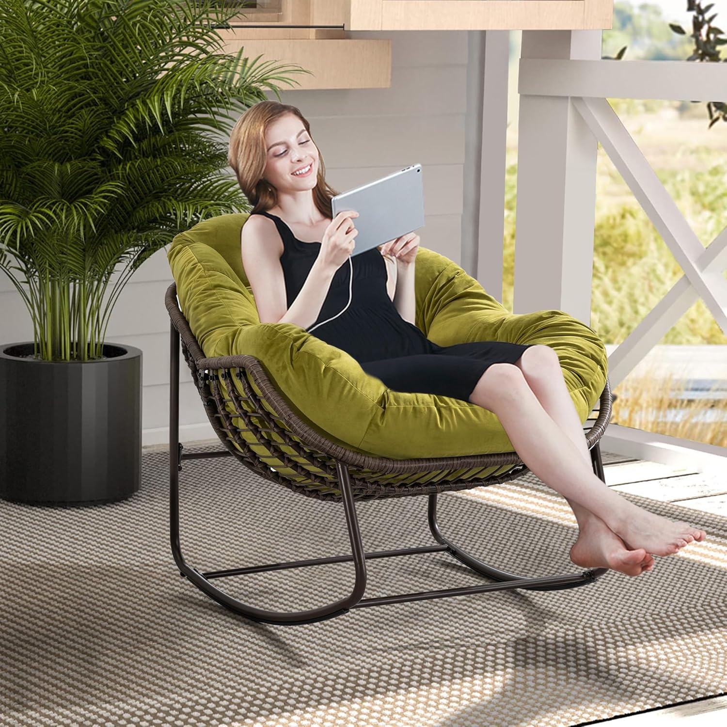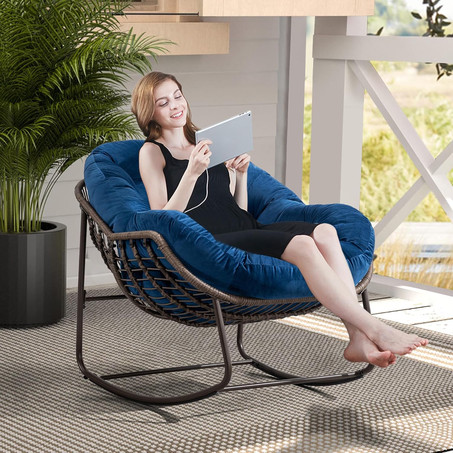 Product Weights & Dimensions & Description: Product Dimensions:43.70"D x 37.20"W x 31.50"H Special Feature:Rocking Material Finish Type:Steel Recommended Uses For Product:Outdoor,Living Room, Relaxing,Garden Finish Type:Polished Room Type:Game Recreation Room, Bedroom, Living Room Frame Material:Steel Maximum Weight Recommendation:250 Pounds Fabric:220g Spun-polyester Seat Material Type:Faux Fur Carton Size:1PC: 104*29*74cm Item Weight:20.00KGS / 16.5KGS Indulge in the art of relaxation with our exquisite Rattan Rocking Chair, a masterpiece that harmoniously blends timeless elegance with the soothing rhythm of gentle motion. Crafted to perfection, this rocking chair is more than just a piece of furniture – it's a sanctuary of comfort and style that beckons you to escape the demands of the day. Immerse yourself in the natural allure of rattan, meticulously woven into an intricate pattern that exudes a sense of refined beauty. With each curve and line, the chair tells a story of expert craftsmanship and the fusion of nature's grace with human ingenuity. Place it in your garden, on your porch, or within your living space – wherever it finds its home, it transforms the environment into a tranquil oasis. As you settle into the embrace of this rocking chair, you'll be greeted by a symphony of comfort. The ergonomic design cradles your body, while the gentle sway transports you to a realm of pure relaxation. The soft cushions provide a luxurious touch, inviting you to linger a little longer and savor the moments of serenity. But our Rattan Rocking Chair is not just a testament to comfort; it's a celebration of durability and versatility. Crafted from high-quality rattan, it stands as a testament to resilience against time and the elements. Rain or shine, indoors or outdoors, this chair thrives in various settings, adding a touch of rustic charm wherever it resides.