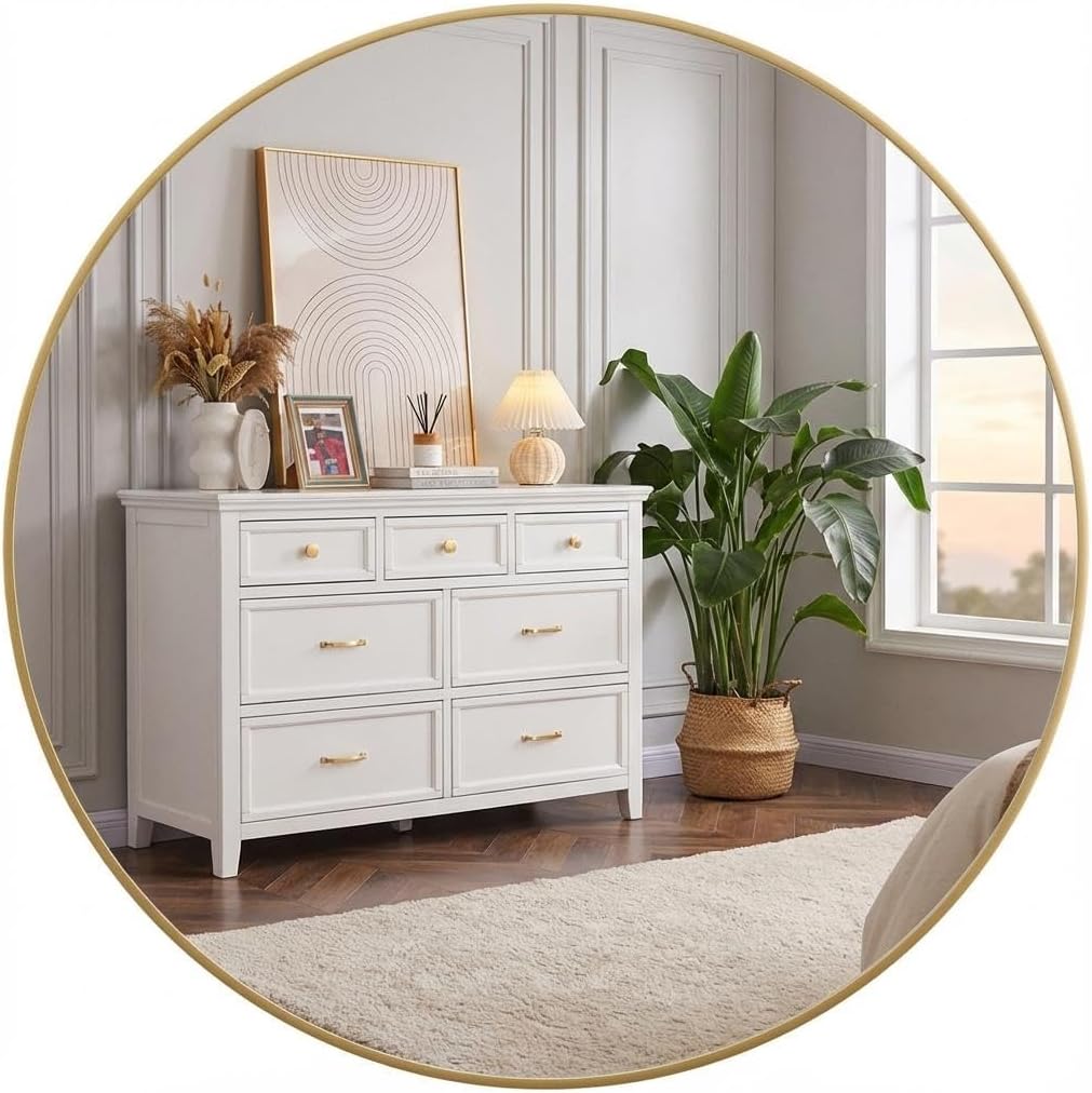 Round Mirror - Wall Mounted Circle Bathroom MirrorFeaturing 20mm aluminum frame with brume-resistant coating. Tempered glass construction for residential interiors.Technical SpecificationsFeatureDetailDiameter36 inchesGlass Thickness4mm temperedFrame20mm aluminum alloyMountingKeyhole hangersWeight Capacity55 lbsFunctional HighlightsAmbient Light Enhancement: Circular design amplifies room lightingCondensation Management: Protective coating reduces fog buildupMulti-Room Application: Suitable for bathrooms, bedrooms, and entrywaysInstallation System: Includes hardware for drywall/plaster surfacesFor interior residential use only. Professional installation recommended. Clean glass with vinegar solution. Avoid abrasive cleaners. Maintain 40-70°F environment. Not for commercial or high-humidity applications.
