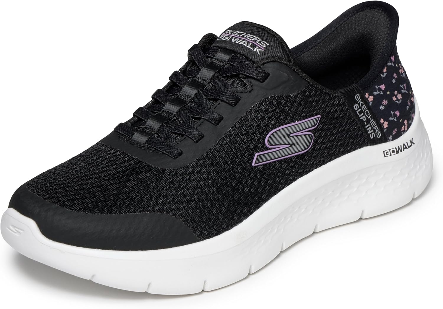 Skechers Hands Free Slip-Ins: Go Walk Flex - Lily Rose features a breathable athletic mesh upper and a beautiful printed heel design. This lightweight walking style has responsive ULTRA GO midsole cushioning, an Air-Cooled Memory Foam insole, and elastic bungee laces that function as a slip-on. It's made with 100% vegan materials and is machine washable.