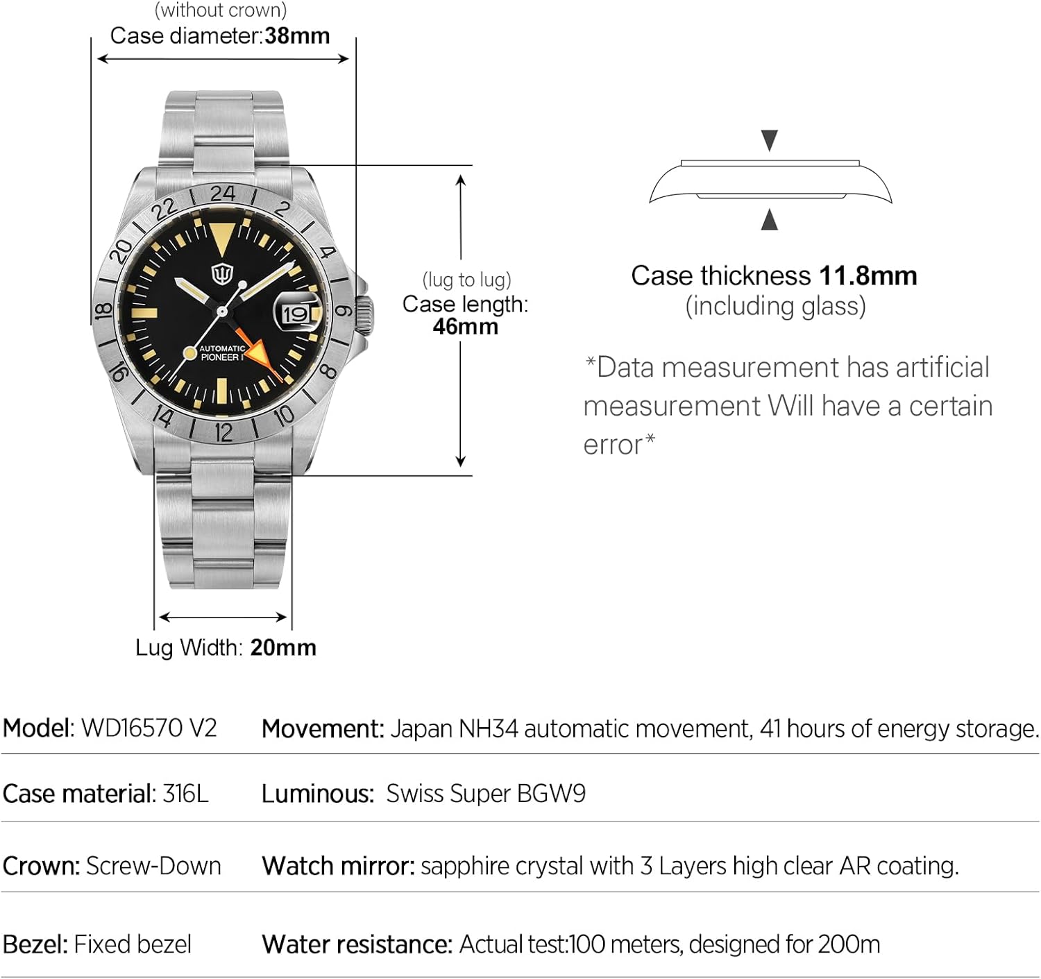 Watch Specification Brand: watchdives Model: WD16570 V2 PIONEER Movement: Japan NH34 automatic movement, 41 hours of energy storage Case material: 316L Bezel: Fixed bezel Watch mirror: sapphire crystal with 3 Layers high clear AR coating Water resistance: Actual test:100 meters, designed for 200m Luminous: Super BGW9 Blue Luminous Crown: Screw-Down Case back: Screwback Case Buckle: Milled Adjustment Clasp Band: 316L stainless steel bracelet Watch Dimension Case diameter: 37mm(without crown) Bezel:38mm Case length: 46 mm(lug to lug) Case thickness: 11.8mm(including glass) Lug width: 20mm