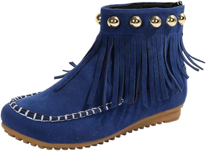 Pattern: Solid color Product category: Fringe boots Upper material: Suede Lining material: Cotton Boot shaft material: PU Insole material: PU Sole material: Rubber Color: Beige, Blue, Brown, Black Heel height: Flat heel Calf height: Low calf Trend elements: Metal, Fringe Toe shape: Round toe Wearing method: Back zipper Suitable gender: Women Suitable seasons: Autumn, Winter, Spring